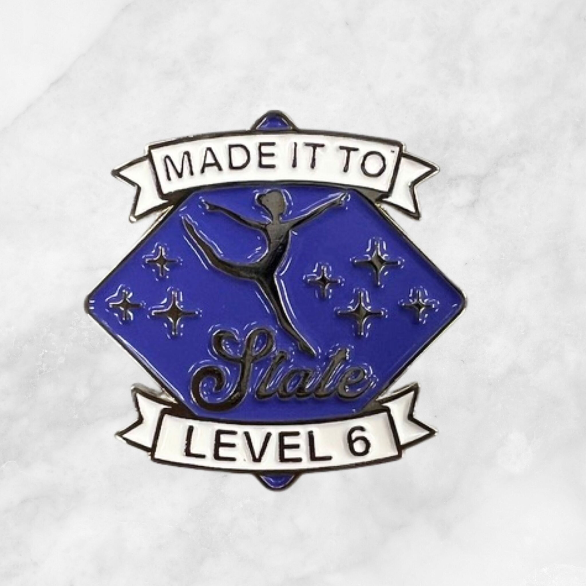 Commemorate a major milestone in your gymnastics journey with this "Made it to State" Level 6 enamel pin. This pin is the perfect way for gymnasts to celebrate their hard work, dedication, and the achievement of qualifying for the state championships.