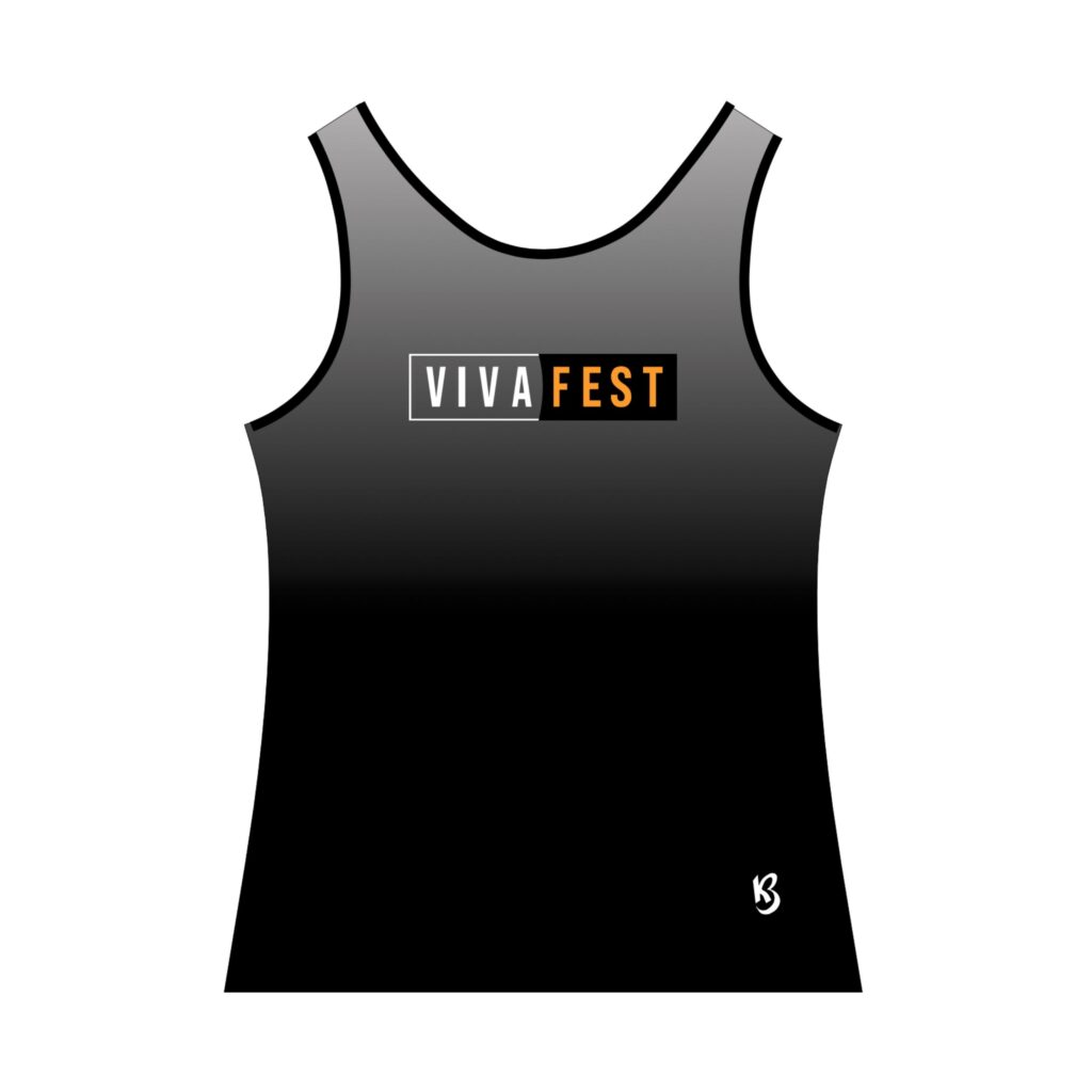 "VivaFest" Branding: Features a high-contrast chest graphic in clean white and vibrant orange, celebrating the energy of the fitness community.
